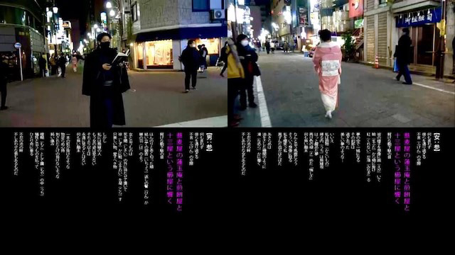 2人の若手オペラ歌手が仲町通りの端と端を起点に、即興で歌唱しながら交差するオンサイト野外パフォーマンス「雁」。Camerata Projectが森鴎外の小説『雁』で用いられた「言葉」をコラージュし、オリジナルの台本を創作して2020.12に上演しました。小説中にあらわれる「男女のすれ違い」や「散歩」をモチーフに、仲町通りを独自の世界観に引き込みました。